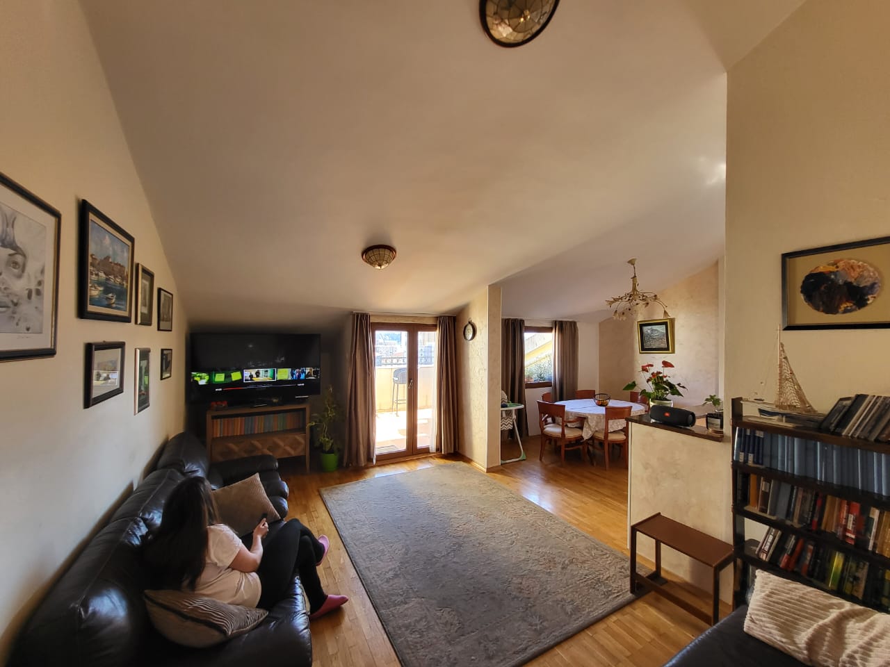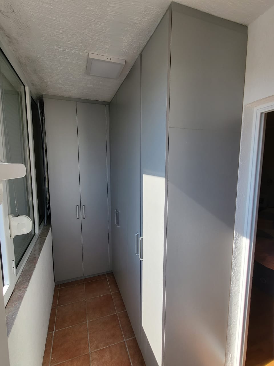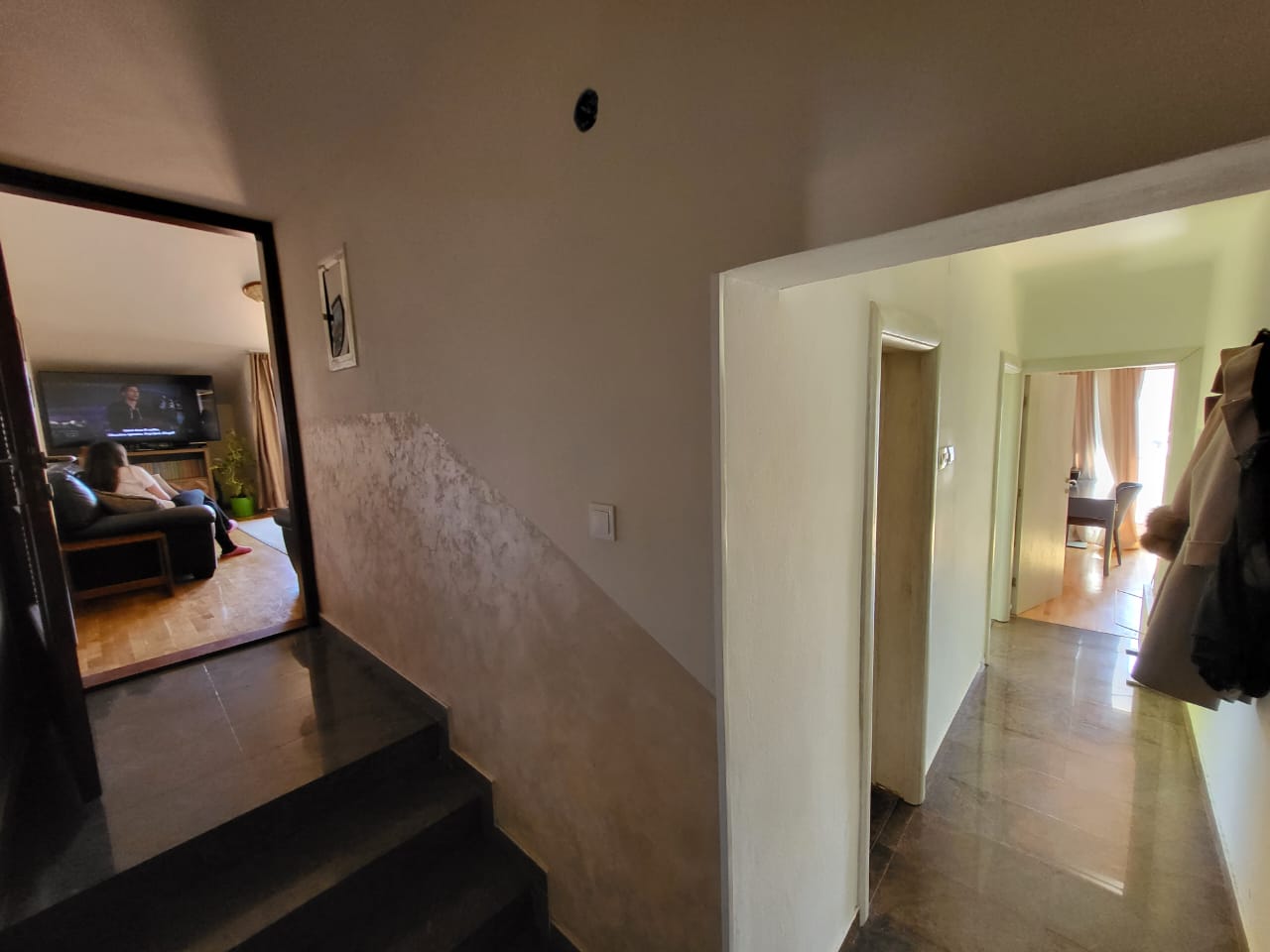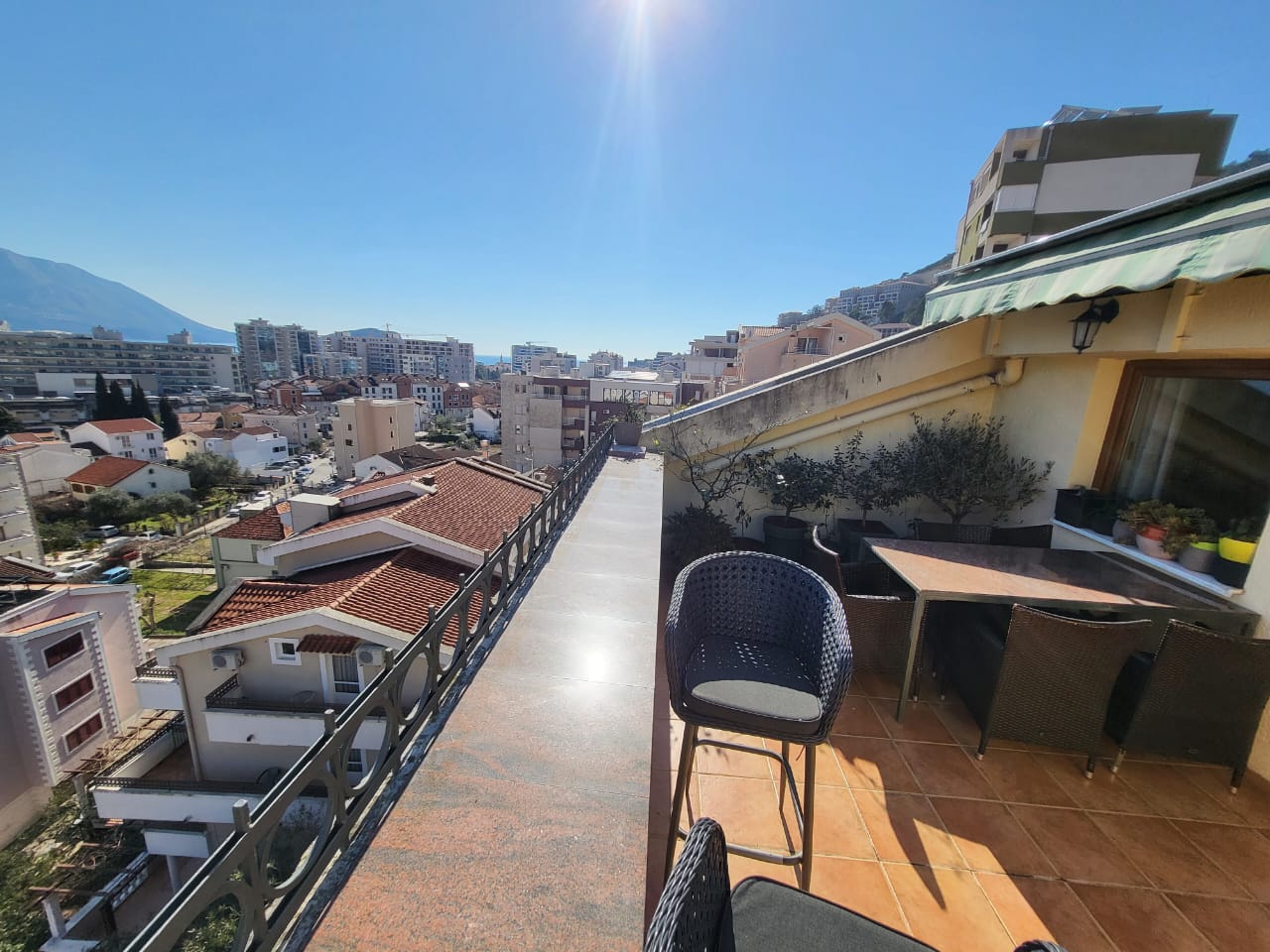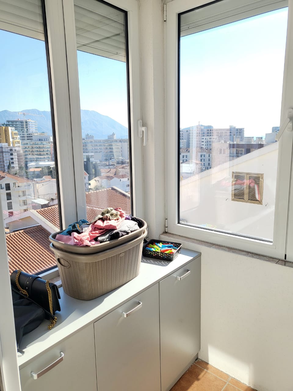 Квартира очень солнечная и светлая, помимо большой террасы, гостиной с кухней и столовой, ванной комнаты, трех спален и гардеробной, в ней есть две кладовки. Она расположена в очень тихом районе на возвышении, откуда открывается один из самых красивых видов на город и море. В здании нет лифта.