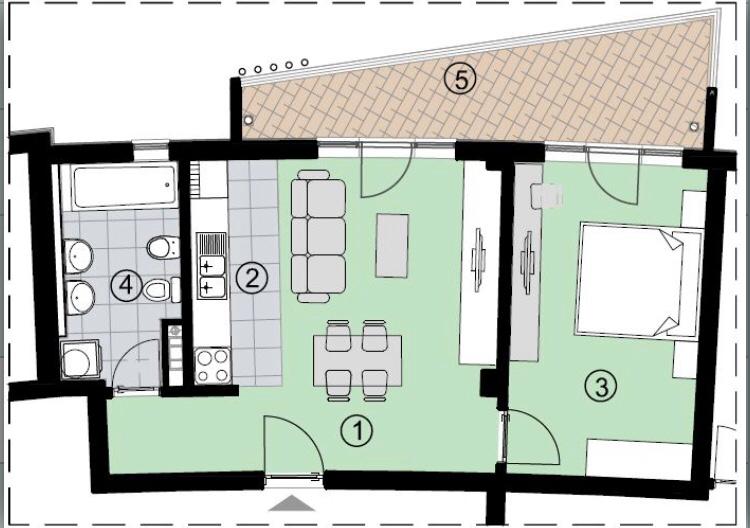 Продается однокомнатная квартира 58м2 в новом комплексе в Бечечи. Вид на гору. Планировка: кухня, совмещенная с гостиной, спальня, санузел и большая терраса