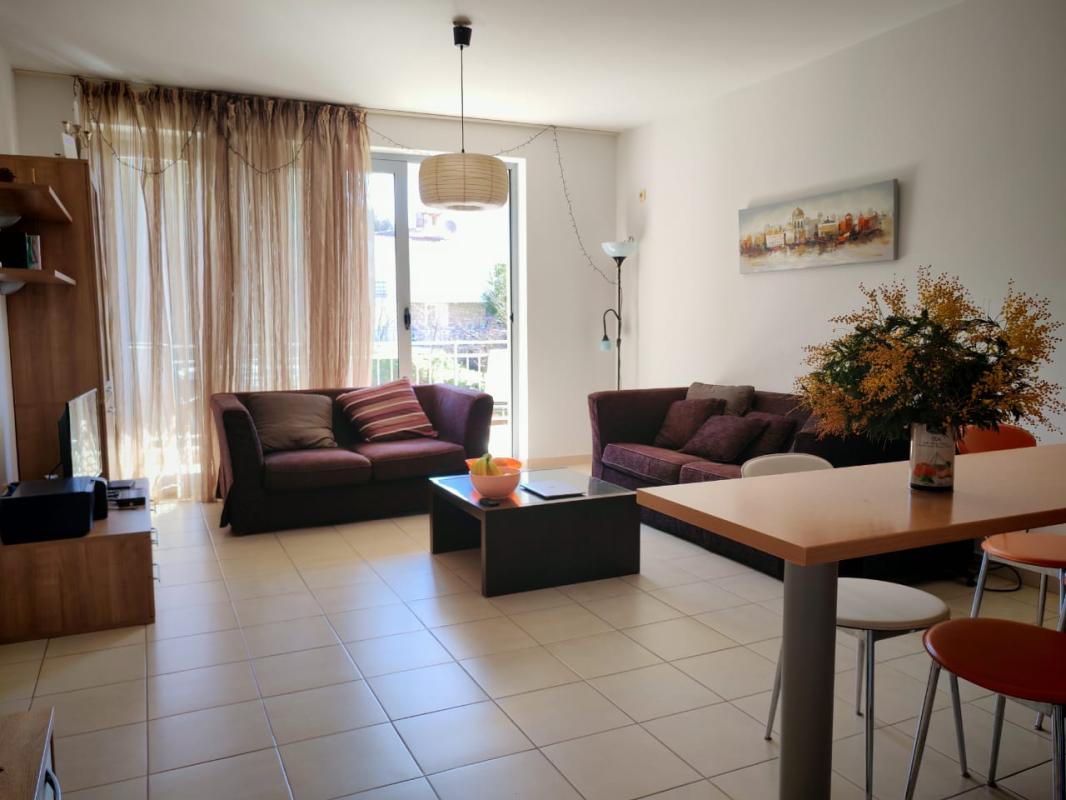 Площадь квартиры 54 кв.м, 2й этаж (лифт). Планировка: гостиная с кухонной зоной, две отдельные спальни, ванная комната, большая терраса с частичным видом на море.