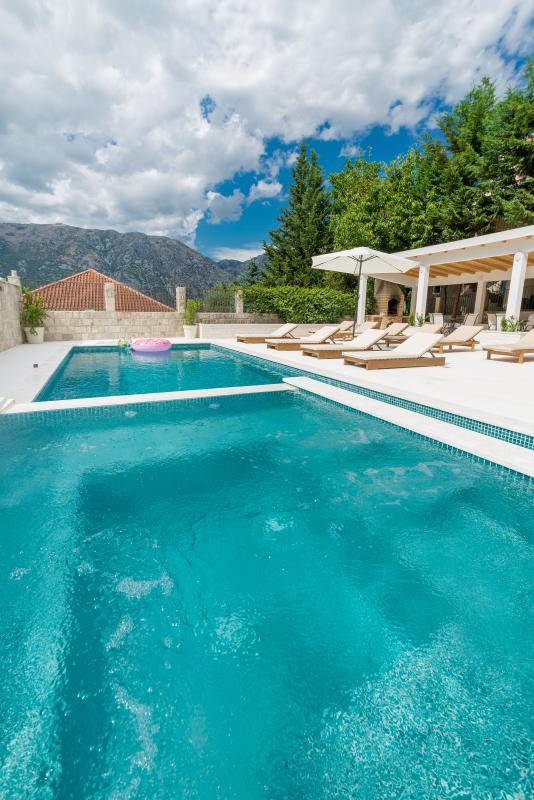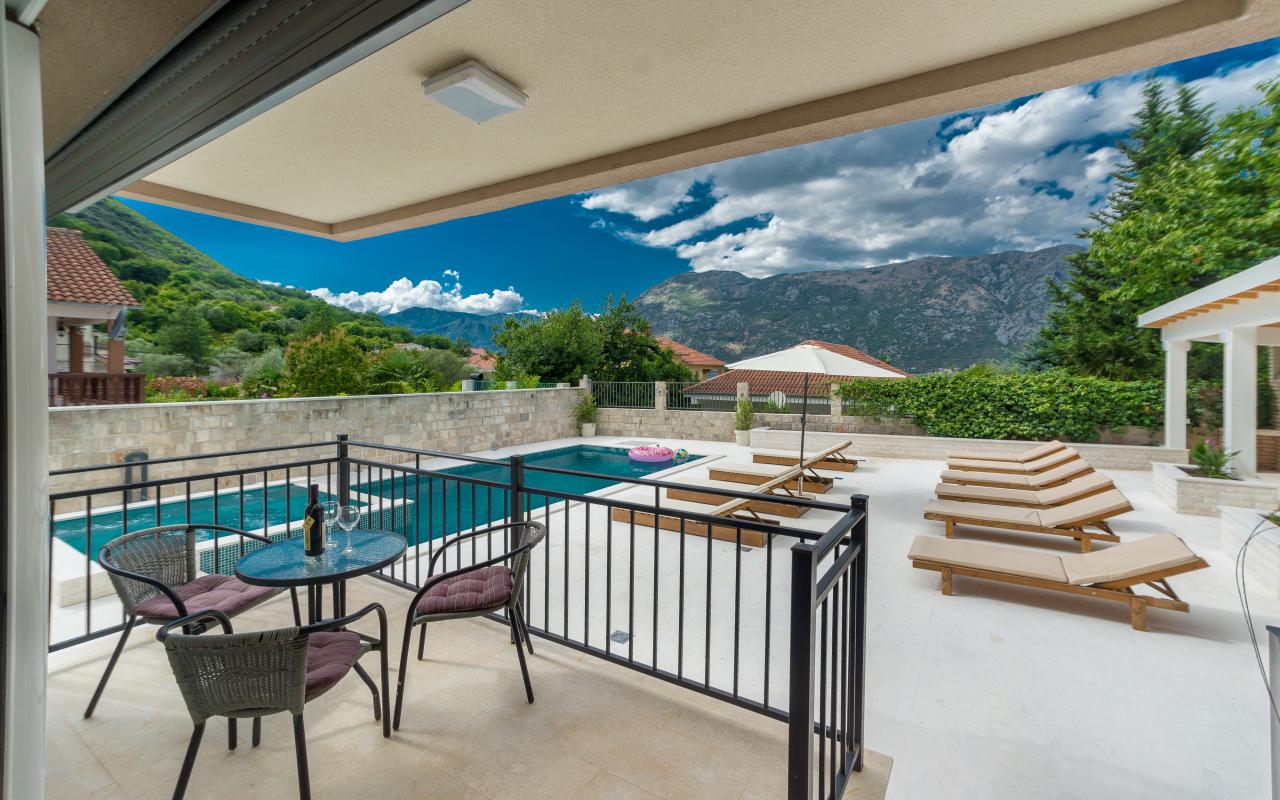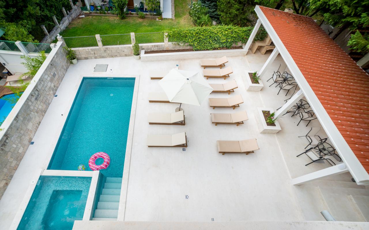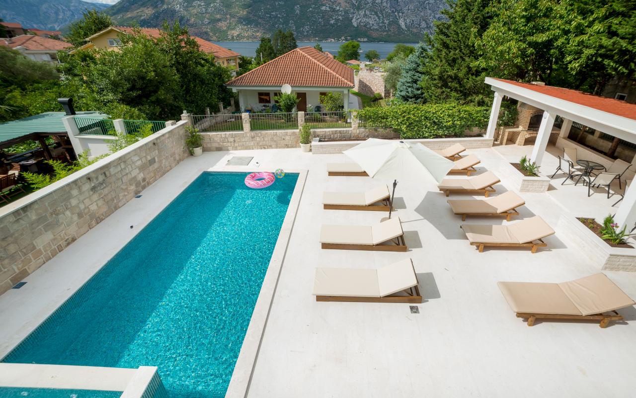 Роскошная трехэтажная вилла с 6 спальнями с потрясающим видом на Которский залив и горы с бассейном, просторным садом с большой беседкой и площадкой для барбекю. Частная парковка на 4+ машины. Две минуты пешком до пляжа. На первом этаже светлая и просторная кухня и гостиная. Кухня оборудована барной стойкой, газовой/электрической плитой, многоуровневой духовкой, большим холодильником с морозильной камерой, посудомоечной машиной, микроволновой печью, кофеваркой. Столовая с большими дверями патио, открывающимися на террасу с видом на сад и бассейн, вмещает 12 человек . На первом этаже есть туалет и душ. На втором и третьем этажах 6 спален, по три спальни и две ванные комнаты на каждом этаже. Во всех спальнях, кроме одной, есть собственный балкон. Вилла рассчитана на 12 человек. На вилле есть также отдельная прачечная с 2 стиральными машинами и дополнительная кухня для трапез в саду. Все жилые и спальные зоны оборудованы кондиционерами. Вилла имеет частный бассейн 6,7х3,6м и джакузи 2,5х2,5м.