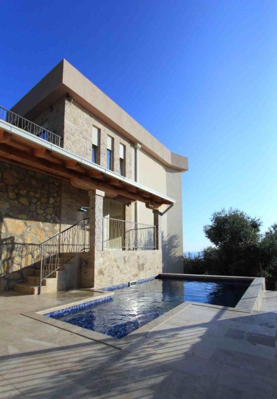 Гостиная выходит во двор с бассейном, во дворе два оливковых дерева возрастом более 100 лет. Двор около 150 м2.